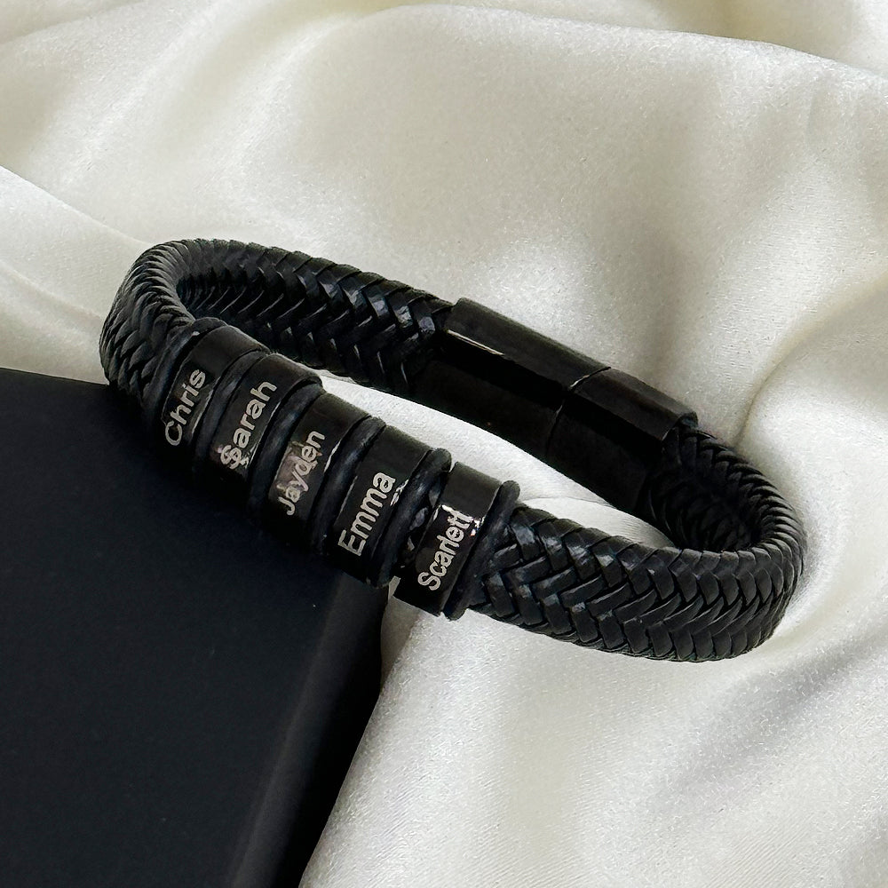 - A customized leather bracelet with engraved beads, each carrying the name of a loved one