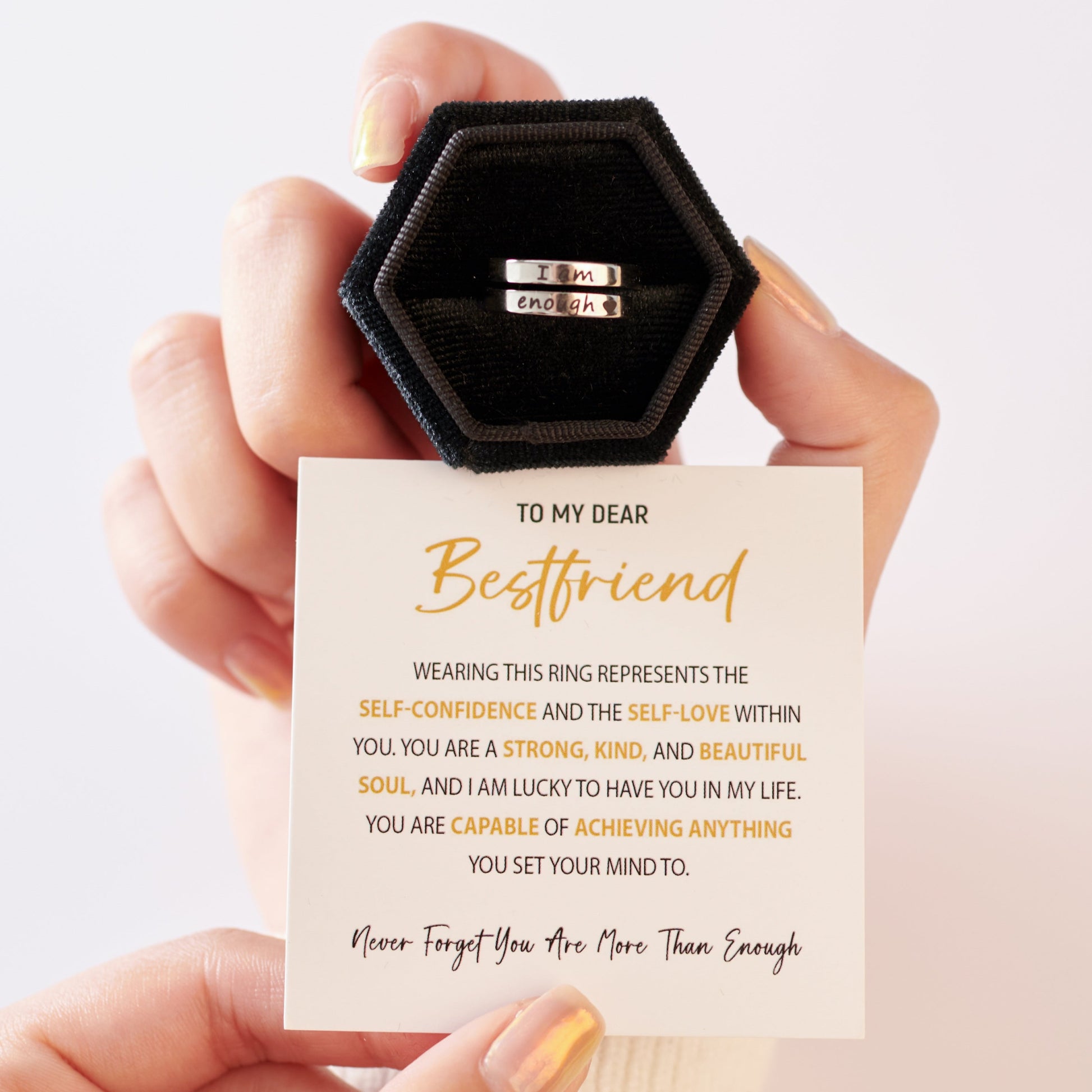 El anillo "I Am Enough" es un recordatorio constante de la propia valía. autoestima y amor. La tarjeta incluida comparte un mensaje de apoyo, confianza y capacitaciónReforzando la importancia del amor propio. Regale ánimo y fuerza con este precioso anillo y demuéstrale a tu mejor amiga lo mucho que significa para ti.