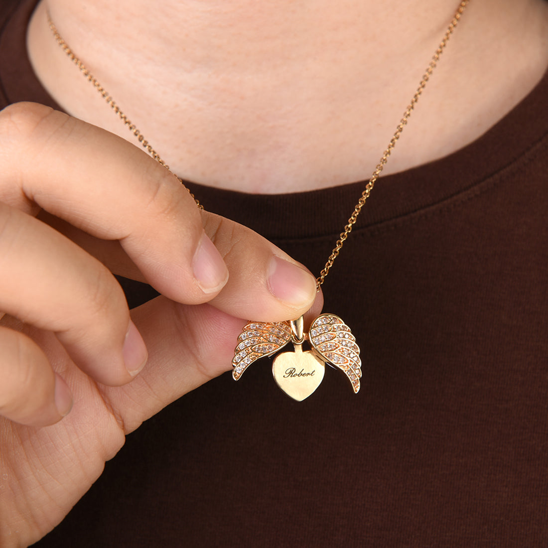 Ce collier n'est pas un simple bijou, c'est un lien durable. Avec son nom gravé à côté d'ailes d'ange et d'un cœur en cristal, il rappelle qu'il est toujours avec vous.