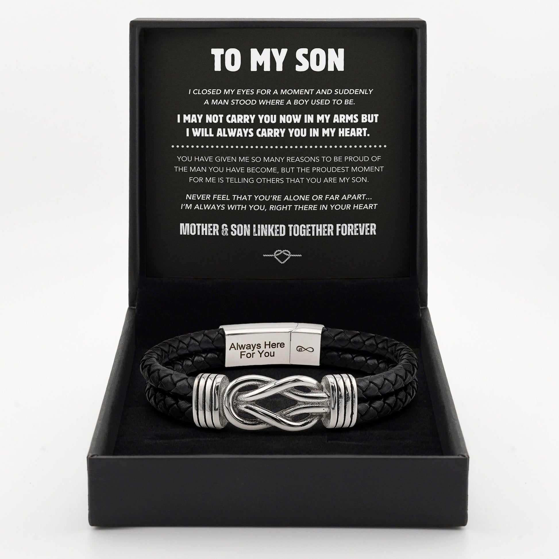 Montrez à votre fils que peu importe où la vie l'emmène, il est toujours connecté à vous. Ce bracelet "Forever Connected" symbolise le lien fort et indéfectible entre une mère et son fils.