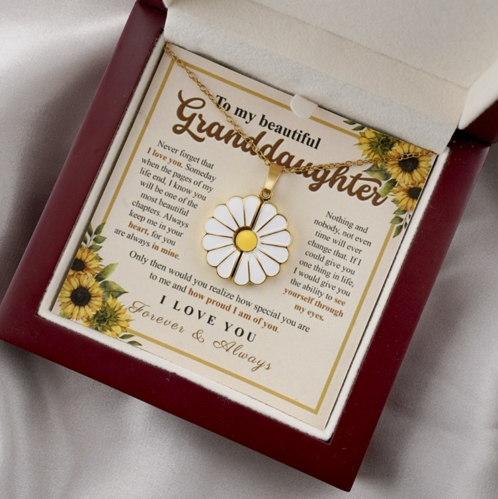 Les tournesols sont connus pour être toujours tournés vers la lumière. Ce collier rappelle gentiment à votre petite-fille qu'elle peut faire face à n'importe quel défi avec résilience. Dans les moments difficiles, elle peut toucher ce tournesol et se souvenir de votre foi en sa capacité à surmonter les obstacles.